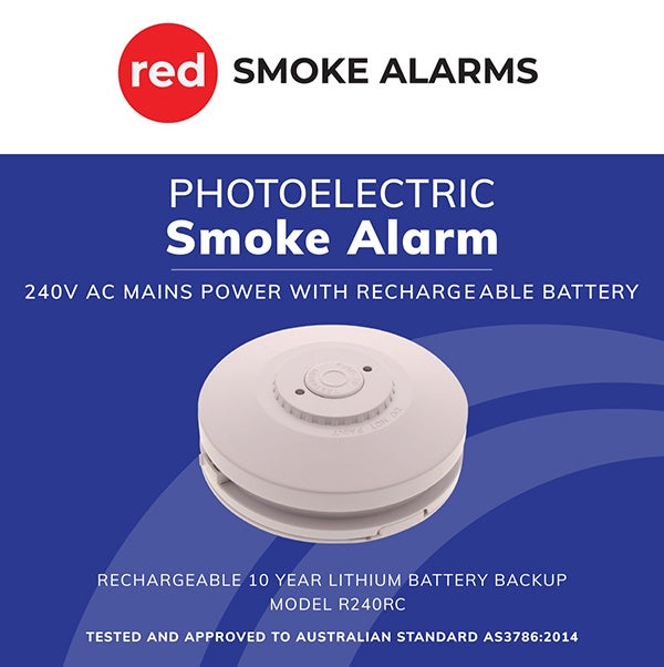 A photoelectric, 240v (hard wired) smoke alarm with a rechargeable lithium battery back up. Interconnectable with up to 40 Red smoke alarms and includes a test/hush button and visual indicators. Can be wirelessly interconnected with the addition of the Red RF wireless base. The R240RC smoke alarm is approved and certified to meet AS3786:2014 and is fully compliant to meet the Queensland 2022 smoke alarm legislation. When the Red RF wireless base is used with this alarm, the Red Smoke Alarm Controller can connect wirelessly to this smoke alarm.